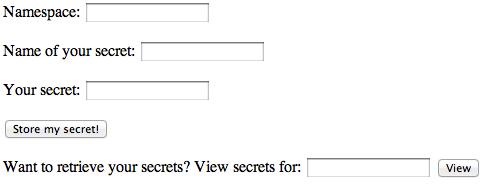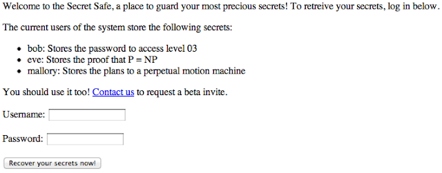The first level starts us off with a simple application. The Secret Safe is a form, written in JavaScirpt and the Mustache JS framework with a SQLite backend, that allows uses to enter a name, a secret name, and a secret, then save it in the database. The secrets can then be viewed by entering the name in a search field. We are told that the password to level one is stored in the database as one of the secrets. However, we don't know the namespace used to save the secret, and thus, cannot simply search for it. Trying out the application a few times allows us to see the functionality, which is relatively simple. Secrets can only be retrieved by entering the correct namespace in the box "view secrets for." Or can they?