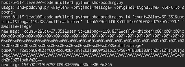 We have the key length (14). The original message is a request from the API such as: "count=2&lat=37.351&user_id=1&long=-119.827&waffle=chicken". We also have the original signature (in my case: bbab520cfdd9b8b91df1e613b0525d252b7c777b). The text we want to append is this: "&waffle=liege". This will override the first variable "waffle" and replace "chicken" with "liege," the name of a premium waffle.